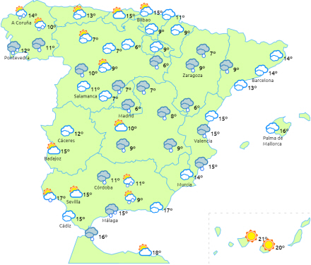 Faldende dagstemperaturer i den vestlige del af halvøen og stigende i nordøst og på De Baleariske Øer. Nattemperaturerne stiger i den vestlige del af halvøen og på Pyrenæerne og falder i Ebro-dalen. Fortsat frost i de indre egne, bjergene og i det indre af Andalusiens østlige egne og den nordøstlige del af halvøen.