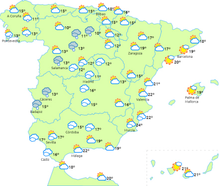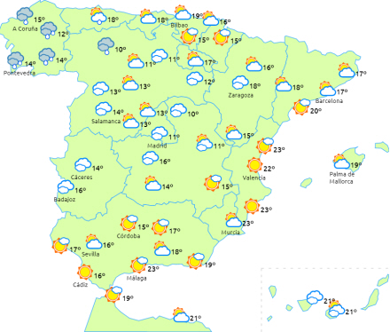 Stigende dagstemperaturer på den østlige halvdel af halvøen og på De Baleariske Øer, mens de falder i Atlanterhavsområderne. Om natten falder de på den sydøstlige halvdel af halvøen og De Baleariske Øer, mens der kun ventes svag frost i Pyrenæerne.