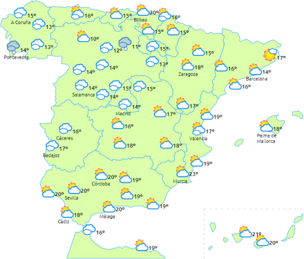 Skyet eller overskyet i Galicien og Castilla y León, hvor vi ikke kan udelukke noget svagt, spredt og lejlighedsvis nedbør i dagens første halvdel.
