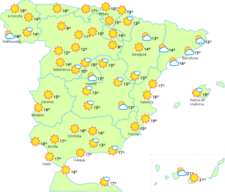 Overskyet eller perioder med lavthængende skyer i dagens første halvdel i store områder af den østlige halvdel af halvøen og på De Baleariske Øer med sandsynlighed for svag regn i den sydlige del af Valencia Regionen og den nordøstlige del af Catalonien.