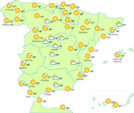 Der forventes stigende dagstemperaturer, som er mest udtalt på De Kanariske Øer og i halvøens indre egne. Nattemperaturerne falder i den nordøstlige del, de nordlige indre egne og den østlige del af de indre egne i syd med svag frost i mange af disse områder - koldest i Pyrenæerne.