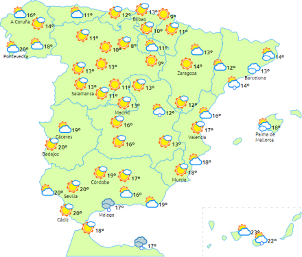 Overskyet himmel i perioder over på halvøen og De Baleariske Øer med tiltagende uklarhed i løbet af dagen og med mulighed for nogle regn- eller tordenbyger,der dog generelt er svage og spredte.