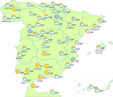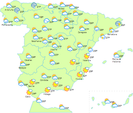 Stigende maksimumtemperaturer i Cádiz-bugten og faldende i Baskerlandet, Catalonien og Valencia. Minimumsniveauerne falder i den vestlige del af de indre egne og stiger i de sydlige indre egne af Andalusien. Der forventes ingen ændringer i resten.