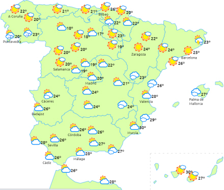 Overskyet himmel over Galicien, Pyrenæerne, det nordøstlige Catalonien og De Baleariske Øer. Det giver nedbør, der kan være ledsaget af torden, og lokalt kan der blive tale om tung nedbør til det vestlige Galicien, de catalanske Pyrenæer og Mallorca.