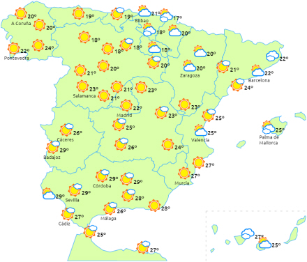 Temperaturerne stiger let i de indre områder mod syd og få ændringer i resten, så den står på 22 til 26 grader. Let nordøstenvind og overvejende briser på sydvestkysten.