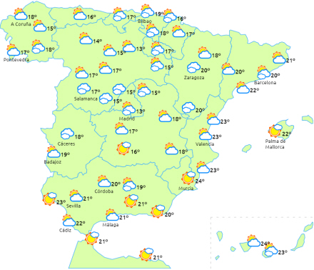 På store dele af den nordvestlige halvdel af halvøen og Pyrenæerne vil et nyt frontsystem give skyet eller overskyet himmel med nedbør i Galicien, der på en svag og spredt måde vil sprede sig østpå indtil Pyrenæerne.