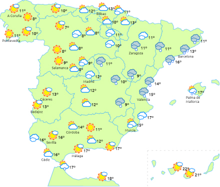I Middelhavsområdet og Strædet er det overskyet med byger og torden, mens nedbøren bliver særligt tung og vedvarende i Valencia-regionen, Murcia og Almería. I løbet af dagens anden halvdel breder nedbøren sig til De Baleariske Øer.