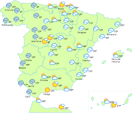 Maksimumstemperaturerne falder i Galicien og det vestlige Cantabrien, mens de stiger i Madrid, Castilla-La Mancha, Guadalquivir-dalen, Balearerne og Melilla. Få ændringer eller let fald i resten.