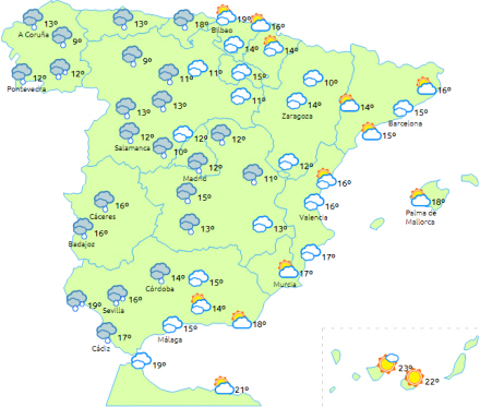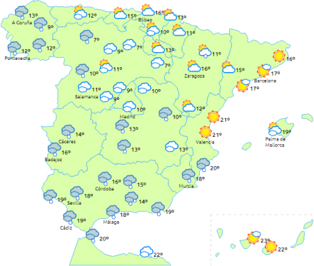 Temperaturer i let fald i Galicien, Catalonien og på De Baleariske Øer. I resten af halvøen stiger de betydeligt, især i minimumsniveauerne i de indre egne og i det indre Andalusien. Få ændringer på De Kanariske Øer.