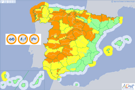 Tung og vedvarende regn i det såkaldte ‘la vertiente atlántica’, mens der advares om stærk eller meget stærk vind i kystområderne langs Atlanterhavet, den øvre Ebro-dal og Pyrenæerne.