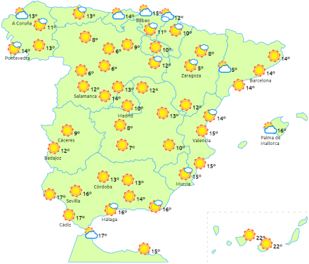 Tåger og lavtliggende skyer ventes dog også i dalene Duero og Ebro, det sydlige Castilla-La Mancha, lavtliggende egne i Huesca og Lleida og det sydøstlige af halvøen.