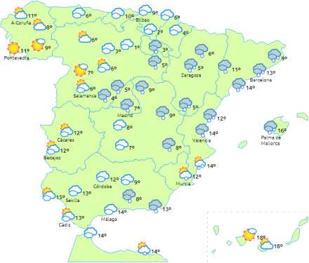 Faldende temperaturer på De Kanariske Øer og i resten generelt. Frost i den nordlige halvdel af fastlandet og bjergene i sydøst. Tungest frost i Pyrenæerne.