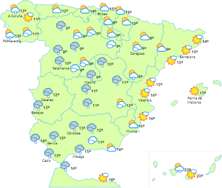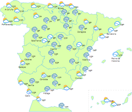 I store dele af Atlanterhavsområderne forventes overskyet himmel med nedbør, og vådest bliver det i Extremadura, det sydvestlige Castilla y León, Madrid, det vestlige Castilla-La Mancha og Andalusien.