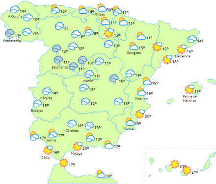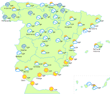 Stigende maksimumtemperaturer i de indre egne og det østlige Andalusien, mens de falder i Ebro-dalen og ellers få ændringer i resten. Stigende minimumstemperaturer til den nordvestlige halvdel og halvøens sydøstlige halvdel. Frost i bjergene i de indre og østlige egne, som er mest intens i Pyrenæerne.
