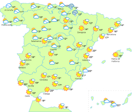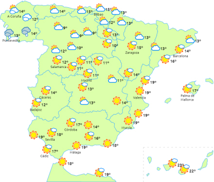 Faldende dagstemperaturer på den nordlige del af halvøen, mens de stiger i sydøst. Nattemperaturerne falder i nordvest, mens også de stiger i den sydlige halvdel af fastlandet, Ebro-dalen og på De Baleariske Øer.