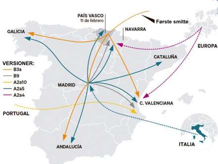 Coronavirus kom ind i Spanien i Vitoria i Baskerlandet (Pais Vasco) i februar og spredte sig fra Madrid i hele marts måned.