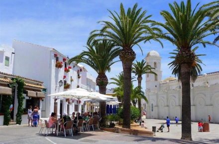 Conil-centrum med den gamle maurisk-inspirerede kirke i baggrunden