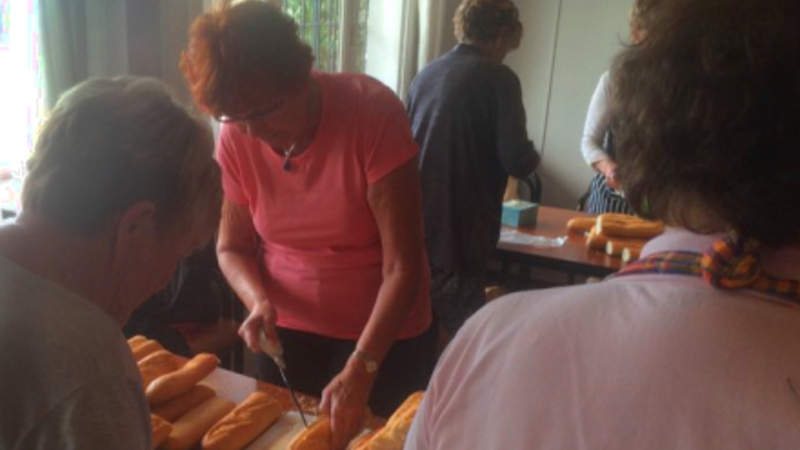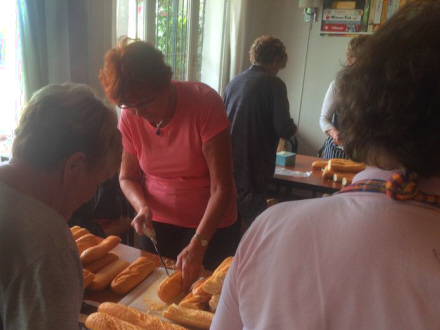 Gerta Sapalle står ved bordet, der er placeret tættest på køkkenet. Hun skærer det ene sandwichbrød efter det andet med rutineret hånd. Det er tydeligt, at hun er erfaren i et køkken.