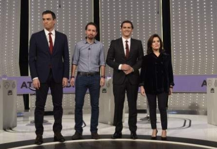 Pedro Sánchez (PSOE), Pablo Iglesias (Podemos), Albert Rivera (Ciudadanos) og Soraya Sáenz de Santamaría (PP)