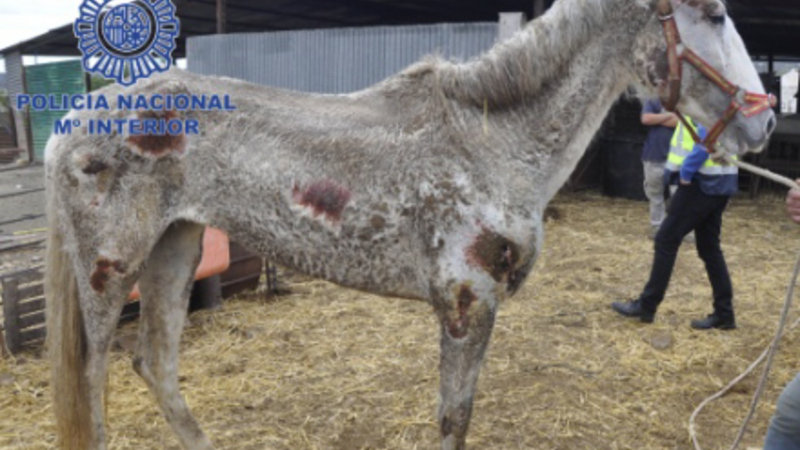 Det fremgår af en pressemeddelelse samt en video fra Policía Nacional, der har anholdt to personer på henholdsvis 44 og 75 år for grov dyremishandling efter at have fundet 22 heste og fire hunde med tydelige skader.