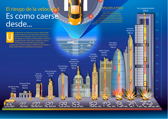 Internationale organisationer anbefaler, at hastighedsgrænserne fastsættes under hensyntagen til de kræfter, som den menneskelige krop kan tåle. Og her har man lavet et billede, der i den grad udpensler, hvad fart betyder. Det kan nemlig omregnes til at falde fra specifikke højder, at blive ramt af eller kollidere med noget, der køre med en specifik fart: