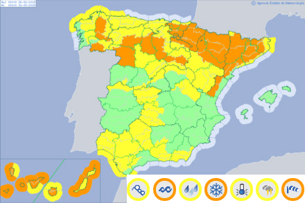 Den blev udsendt klokken 13 og advarer om regn, sne og vind på hele Den Iberiske Halvø og De Kanariske Øer.