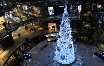 Masser af mennesker spadserer på det brede strøg, hvor bilerne køer på siderne i hver sin retning. Jule-illuminationen er helt fantastisk om aftenen.