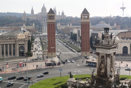 Udsigten over Plaça d'Espanya, Fira de Barcelona og kunstmuset på Montjuïc. I baggrunden til højre ses den kommunikationsmast, som blev opført i forbindelse med de olymliske lege.