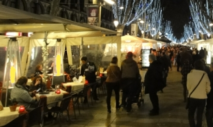 På en lang strækning har barer og restauranter opført telte, hvor tjenerne aktivt forsøger at trække ind til blandt andet - sjovt nok - sangria i store glas