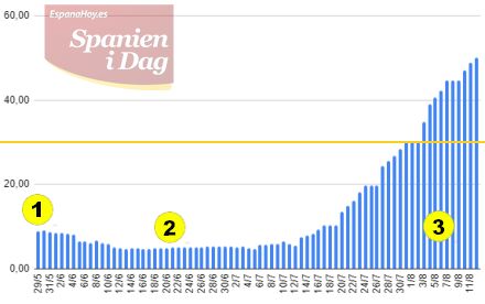 Det gik faktisk ret godt i lang tid efter Udenrigsministeriet med sin rejsevejledning den 29. maj sendte Spanien i Orange. Dengang lå smittetallet for Spanien. som Udenrigsministeriet anvender, under de 10 og blev ved med at falde derefter i lang tid.