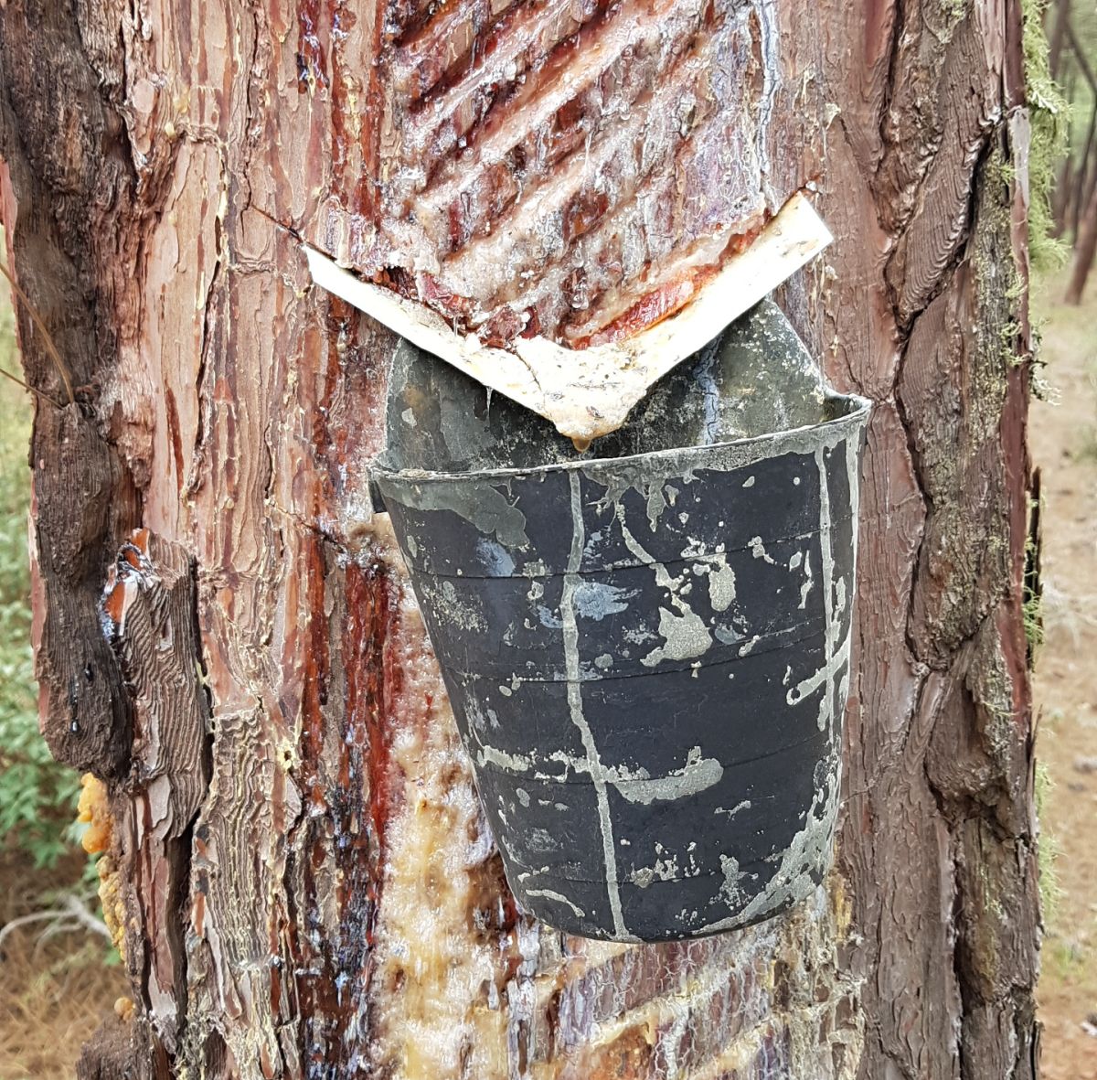 Der drypper meget langsom harpiks lignede væske ned i potten. Det er meget små mængder. Men hvad udvindes, og hvad bruges det til? Det fandt vi ikke ud af...