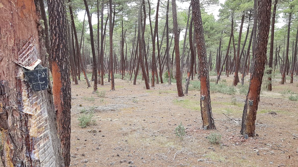 Frokosten holdes ved Puente de Piedra, en ældgammel bro som står ved siden af den moderne betonbro over Douro. Vi kører videre og kommer gennem nogle store fyrretræskove. Her ser vi stammer som er afbarket i den ene side og der er masser af hak i stammen hvor der sidder en lille plastik potte i hakket.