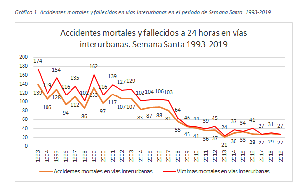 Tallene kommer fra Trafikdirektoratet, DGT, der oplyser, at der på disse 10 dage var i alt 27 dødsulykker. Der blev gennemført 14,9 millioner langdistanceture, hvilket var 3,3 procent flere end i 2018, på trods af det urimeligt ringe påskevejr.