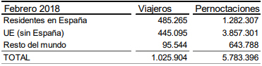 De Kanariske Øer var den foretrukne destination med ophold i lejligheder med flere end 2,5 millioner overnatninger, hvilket var et fald på 4,3 procent i forhold til februar 2017.
