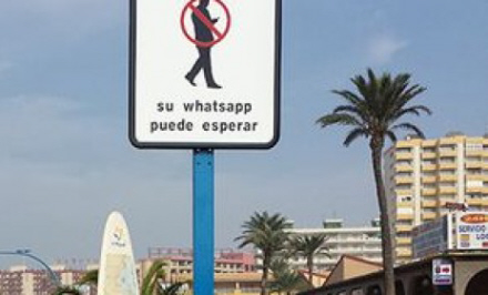 Andre steder er der sat skilte op med "Evita accidentes. Contesta más tarde. Responde tu llamada o mensaje después de cruzar" - Undgå ulykker. Svar senere. Ring tilbage, når du har krydset vejen”.