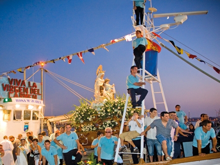 Nogle steder er det traditionen at bære en trone med jomfruen gennem vandet - andre steder bliver hendes statue placeret på en båd og sejlet gennem havet.