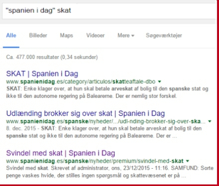 De første resultater er alle fra Spanien i Dag. Det første link leder dig til kategorien med skat, hvor der ligger flere artikler. Den næste linker til konkrete artikler