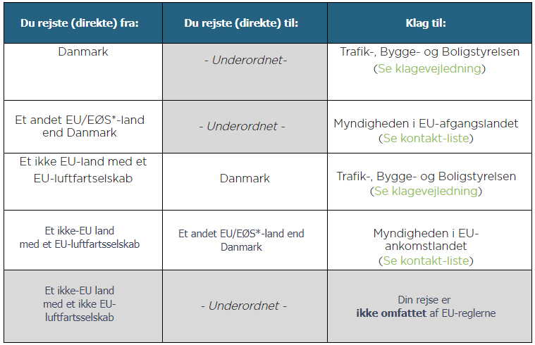 I Danmark har Trafik- og Byggestyrelsen lavet hjemmesiden Flypassager.dk, hvor du kan se alle dine rettigheder som passager. Og en handy oversigt over, hvilken myndighed, du skal henvende dig til, når du er forsinket, er det også blevet til: