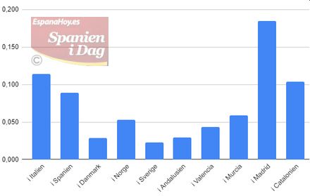 Som det fremgår af grafikken, er Madrid Regionen den, der er aller, aller hårdest ramt, hvor Andalusien ligger lavest i landet - tæt på tallene i Danmark.