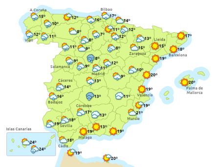 Temperaturerne falder i det meste af fastlandet, mens nattemperaturen falder i hele Middelhavsområdet. Få ændringer på Balearerne og De Kanariske Øer.