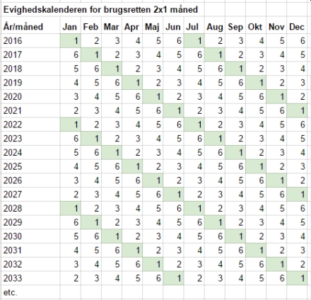 Tallene er de forskellige ejerdeles brugtsrets-perioder