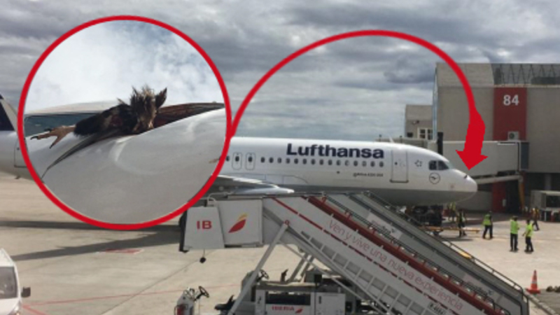 Med et vingefang på omkring tre meter fik fuglen kilet sig fast mellem to samlinger i næsen af flyet. Det skriver Diariodemallorca.es