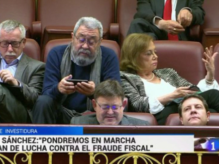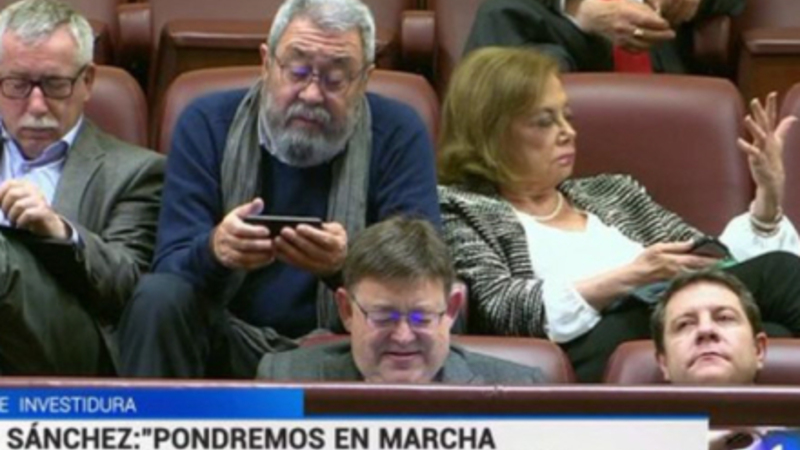 Lederne af Spaniens to største fagforeninger blev fanget af kameraet, mens de legede med deres telefon og tablet. Kvinden ved siden af dem finder sin hånd langt mere fascinerende end ham, der kan blive den fremtidige leder af en af Europas største økonomier.