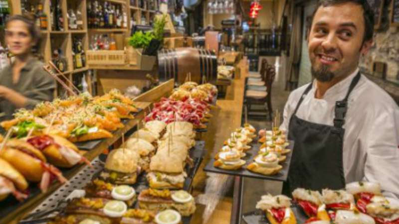 Menuen består af alt lige fra pindemadder, 'Ensaladilla' - en slags italiensk salat - 'Carne de cerdo Adobada', syltet svinekød og 'Patatas bravas' som er stegte kartoffelstykker med chilisauce.