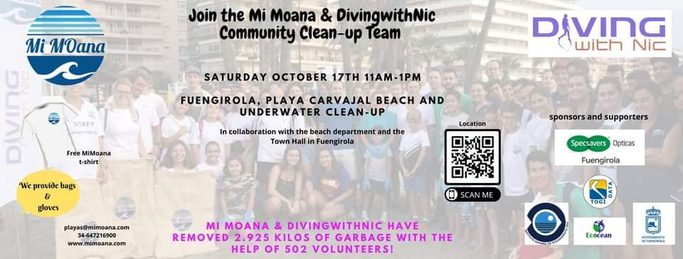 Beach Cleanup / Limpieza de La Playa er organiseret af foreningen Mi Moana og dykkerklubben i La Cala ‘Diving with Nic’ i samarbejde med de lokale strandmyndigheder og Fuengirola byråd. Det bliver sponsoreret af brilleforretningen Specsavers i Fuengirola.
