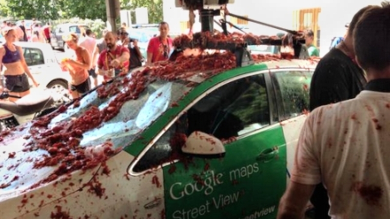 Snesevis af festdeltagere var ikke enige i, at Google med sin Street View bil, der optager panoramabilleder i 360 grader, skulle lægge billeder af Tomatinaen op på nettet bagefter.