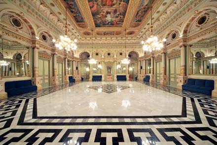 Man må fremhæve vestibulen og Spejlsalen, som ligger på første sal. De er blevet restaureret, men er de originale, som ikke blev ødelagt under nogen af brandene.