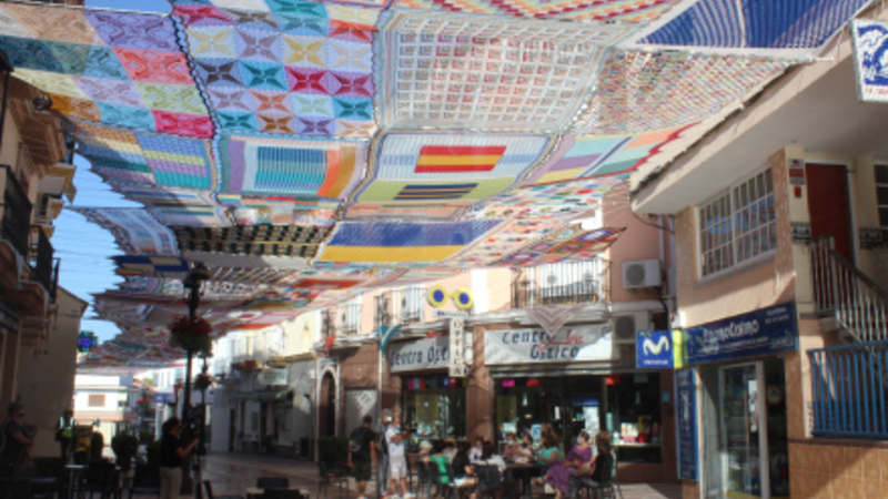 For over de centrale gader i Alhaurín de la Torre finder folk skygge fra de varme solstråler under et farverigt, hæklet kæmpe-tæppe.