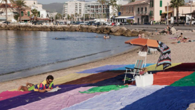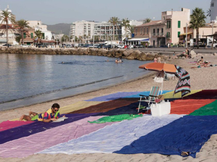Femten håndklæder bredt ud som et stort multifarvet kludetæppe tiltrak sig i går opmærksomheden på playa de Es Molinar på Mallorca.
