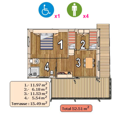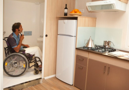 Denne campingplads har også gjort sig umage for at byde kørestolsbrugere velkommen. Her er de handicapvenlige hytter beregnet til at huse én kørestolsbruger og fire gående personer. I højsøsonen koster sådan en hytte 153 euro pr nat.
